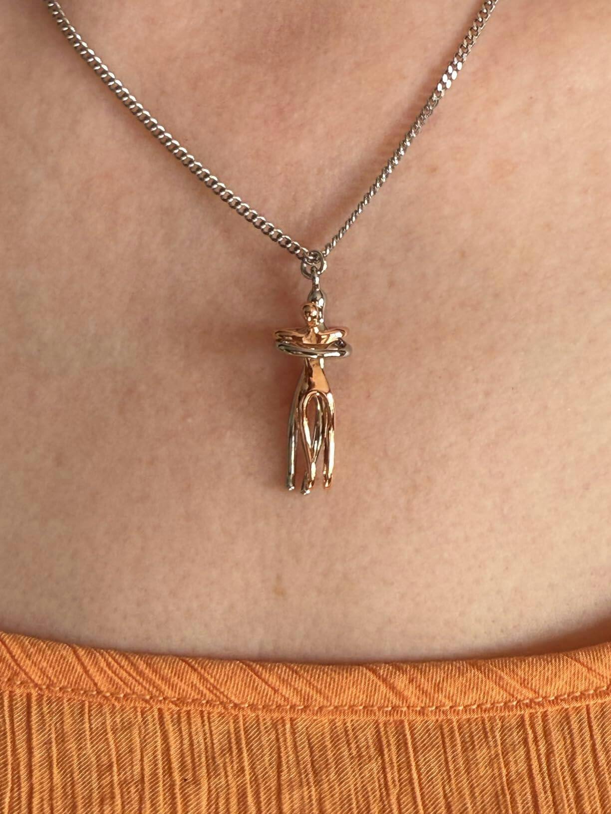 Este colgante escultórico captura el momento exacto de un abrazo infinito.